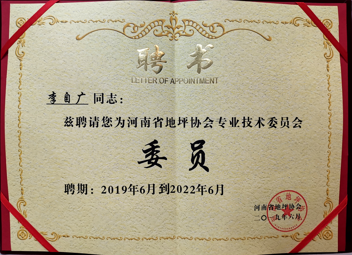 榮獲:河南省地坪協(xié)會(huì)**技術(shù)委員會(huì):“委員”稱(chēng)號(hào)