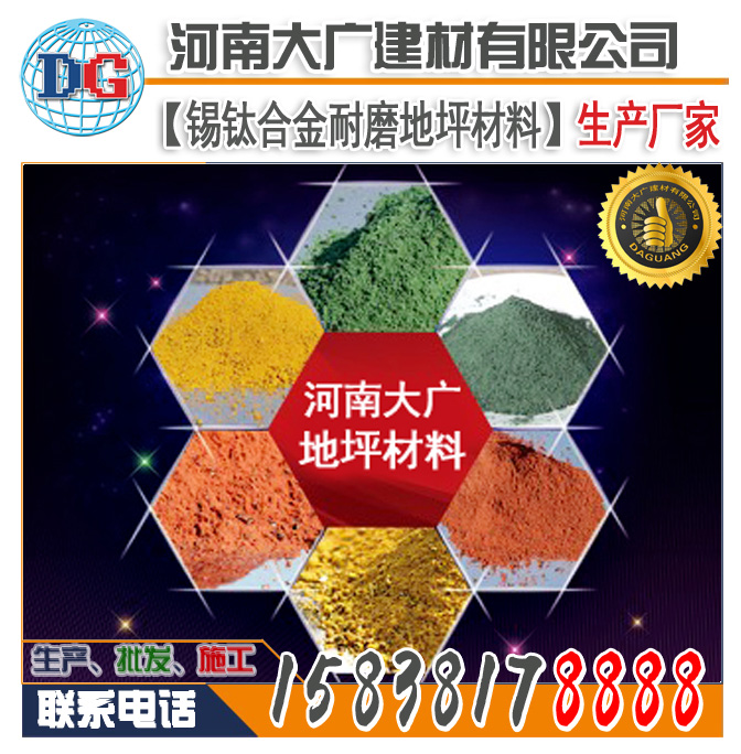 大廣牌錫鈦合金合耐磨地坪材料由一定顆粒級(jí)配的錫鈦合金骨料、高標(biāo)號(hào)水泥、顏料、微硅粉等其它摻合料和外加劑組成。將其均勻地撒布在初凝階段的混凝土表面,經(jīng)專(zhuān)工門(mén)工藝加工,從而使其與混凝土地面形成一個(gè)整體。且具有高致密度性和著色的高性能耐磨地面。