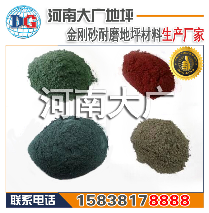 金剛砂骨料和石英砂骨料!本公司采用金剛砂骨料,金剛砂骨料比石英砂骨料硬度更高,效果更美觀!本廠作為河南省金剛砂源頭企業(yè),目前全省大部分廠家的金剛砂骨料由本公司提供,其調(diào)配好的金剛砂地坪材料顏色又分水泥本色、綠色、紅色、藍(lán)色、黃色常用顏色金剛砂耐磨材料,其它顏色也可訂制生產(chǎn)。